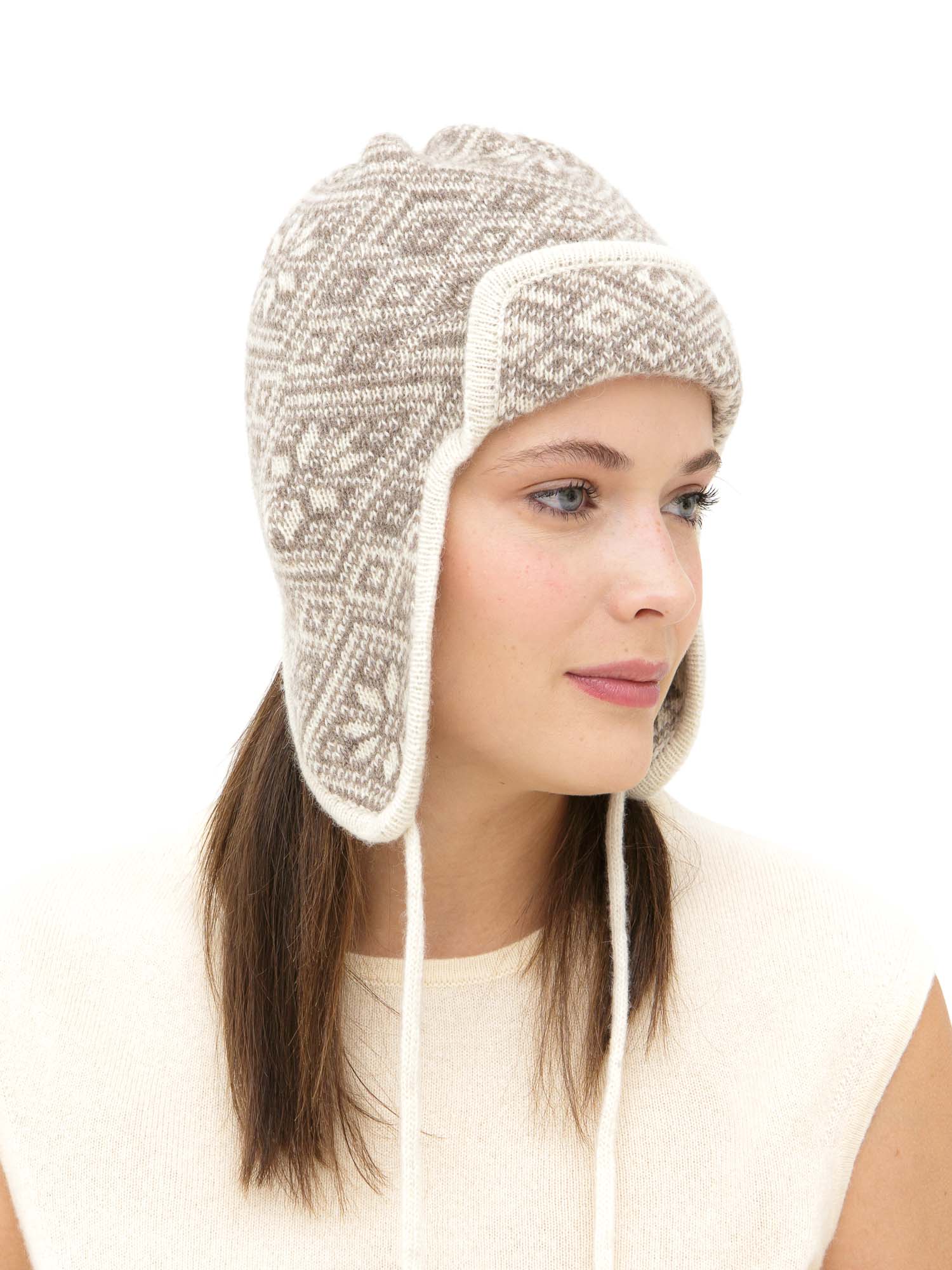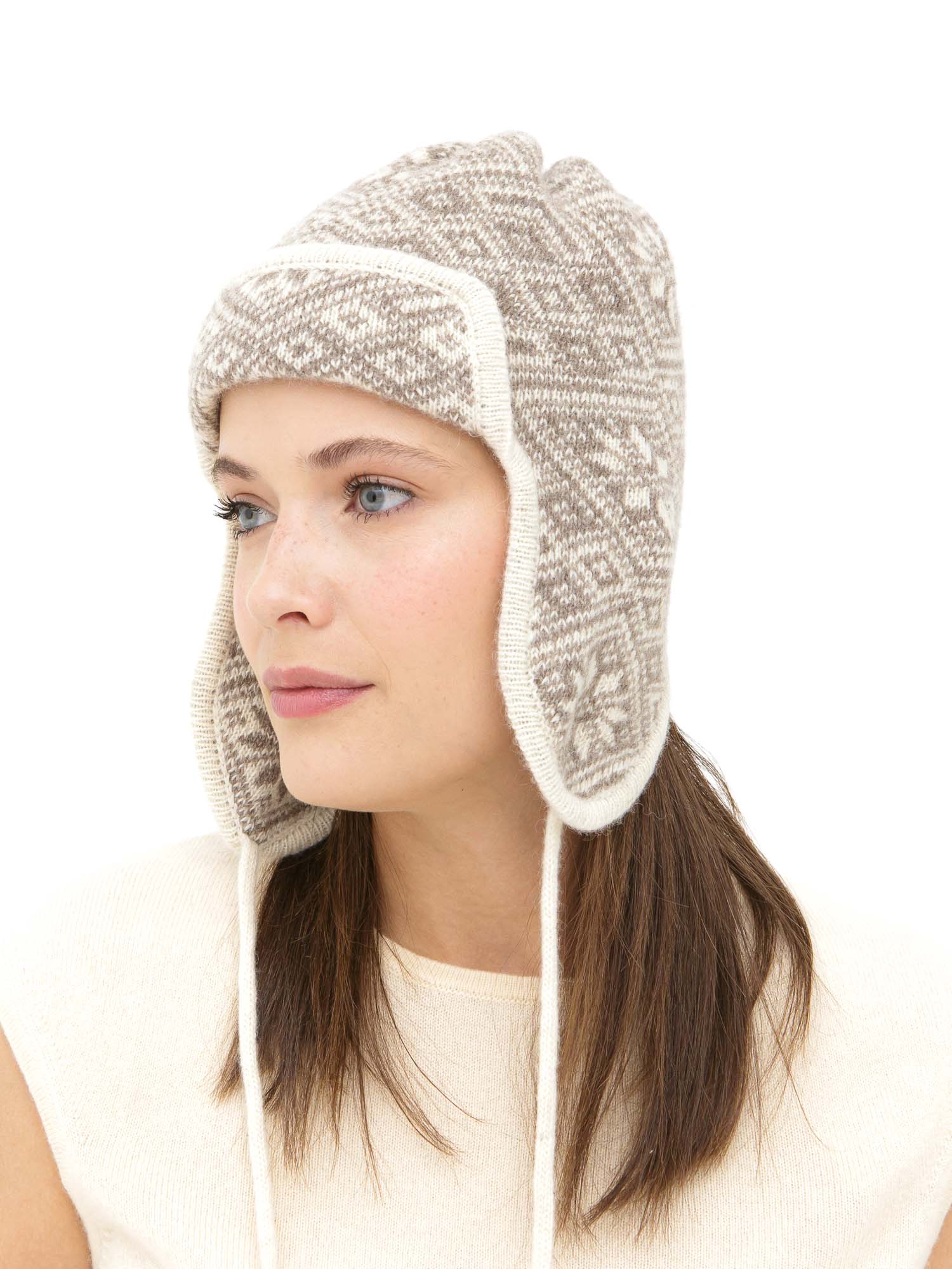 Комбинация оттенков бежевого и какао с аккуратным вязаным узором придаёт модели универсальный и стильный вид. Ушанка легко вписывается как в повседневные, так и в более спокойные городские образы.