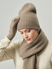 Модель выполнена в классической прямоугольной форме с фактурной вязкой в рубчик. Минималистичный дизайн подчёркивает благородную текстуру кашемира и делает аксессуар универсальным элементом гардероба.
