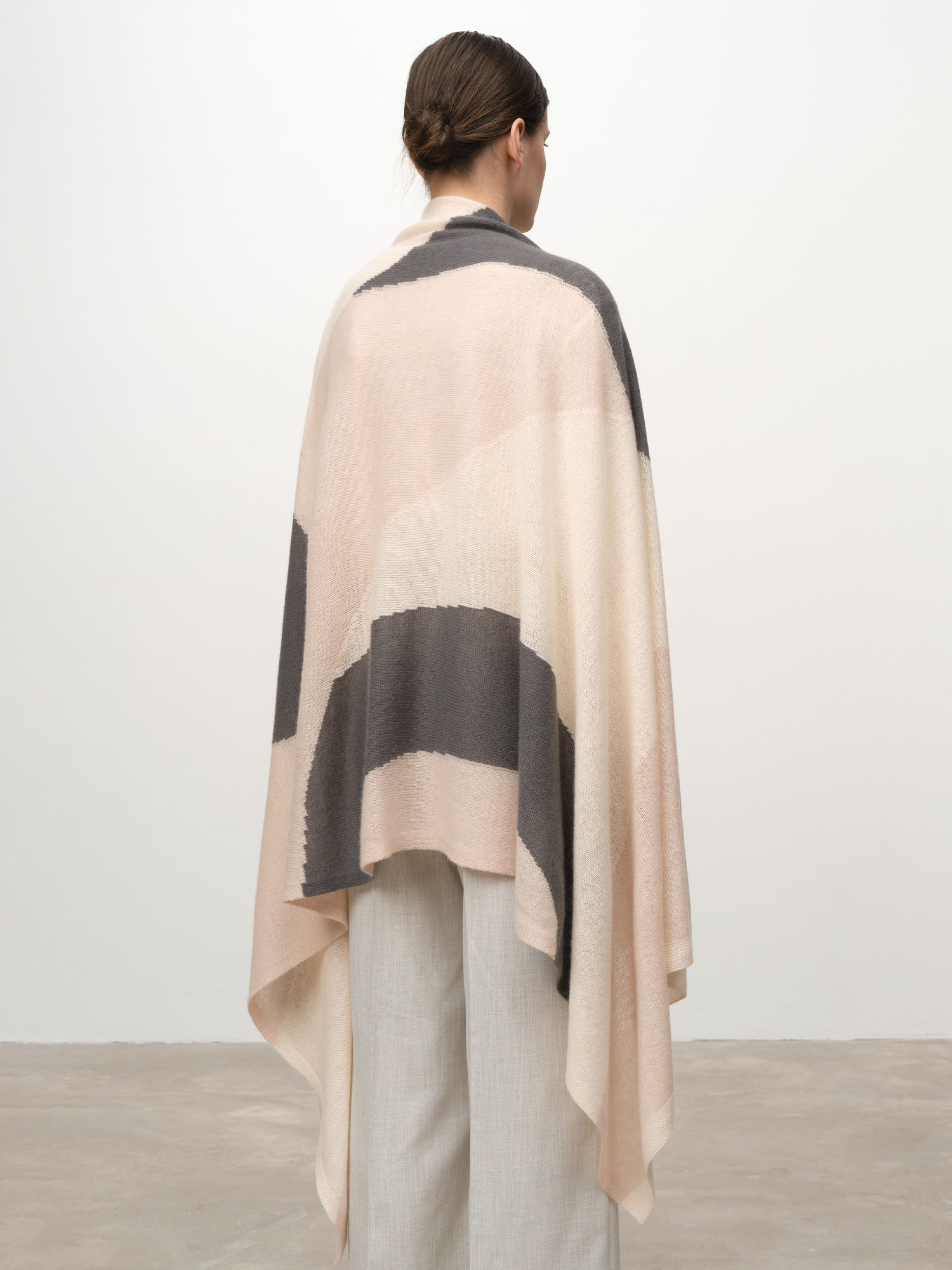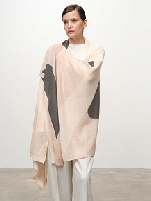 Модель выполнена в формате широкого палантина с лаконичным минималистичным рисунком. Контрастные декоративные элементы создают современный графичный эффект и подчёркивают стиль изделия.