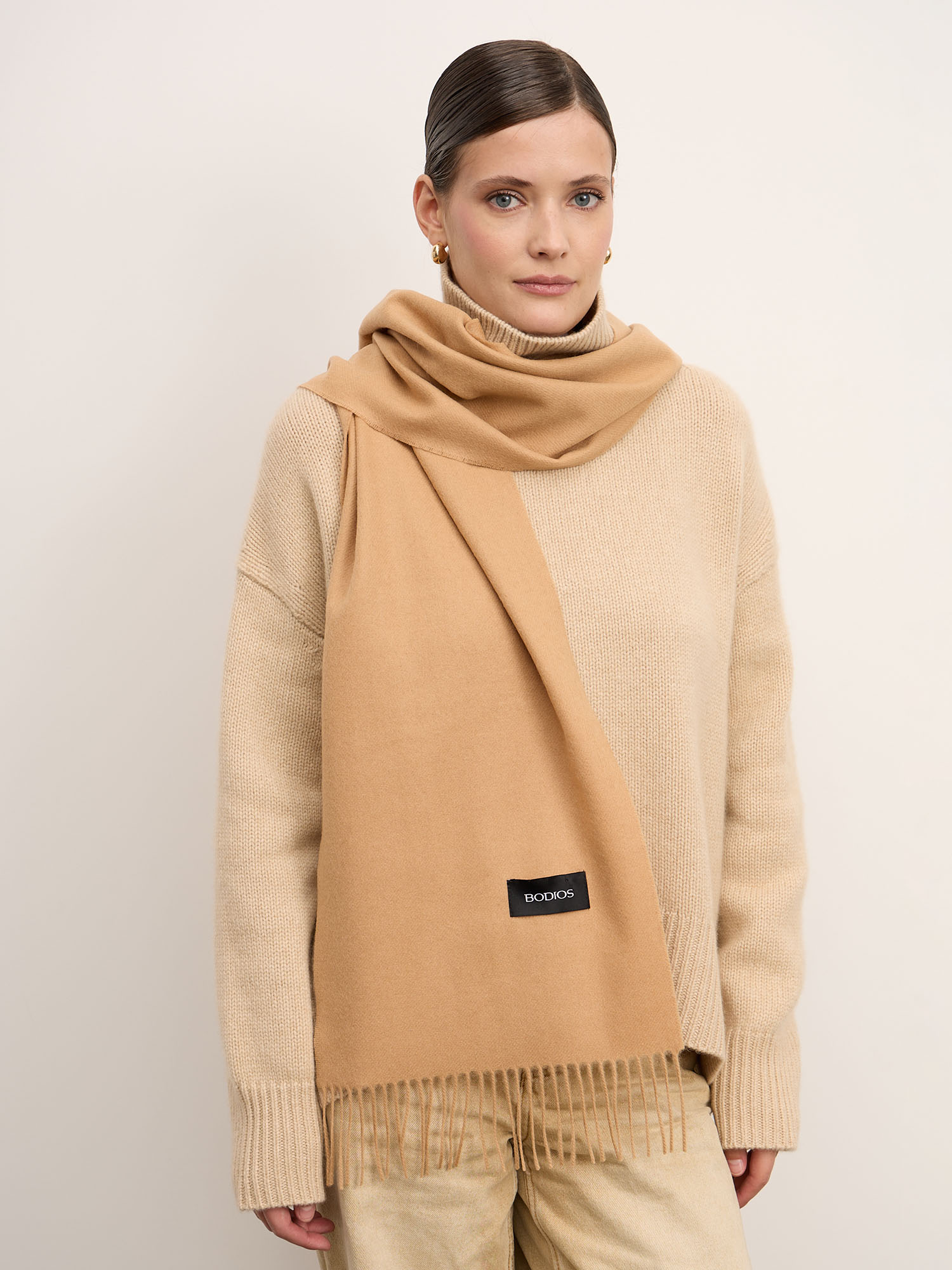 Классический прямоугольный формат позволяет носить шарф различными способами — свободно на плечах, обернув вокруг шеи или создавая многослойные образы. Минималистичный дизайн подчёркивает натуральную фактуру кашемира. Края изделия дополнены аккуратной бахромой, придающей шарфу завершённый и аккуратный вид.