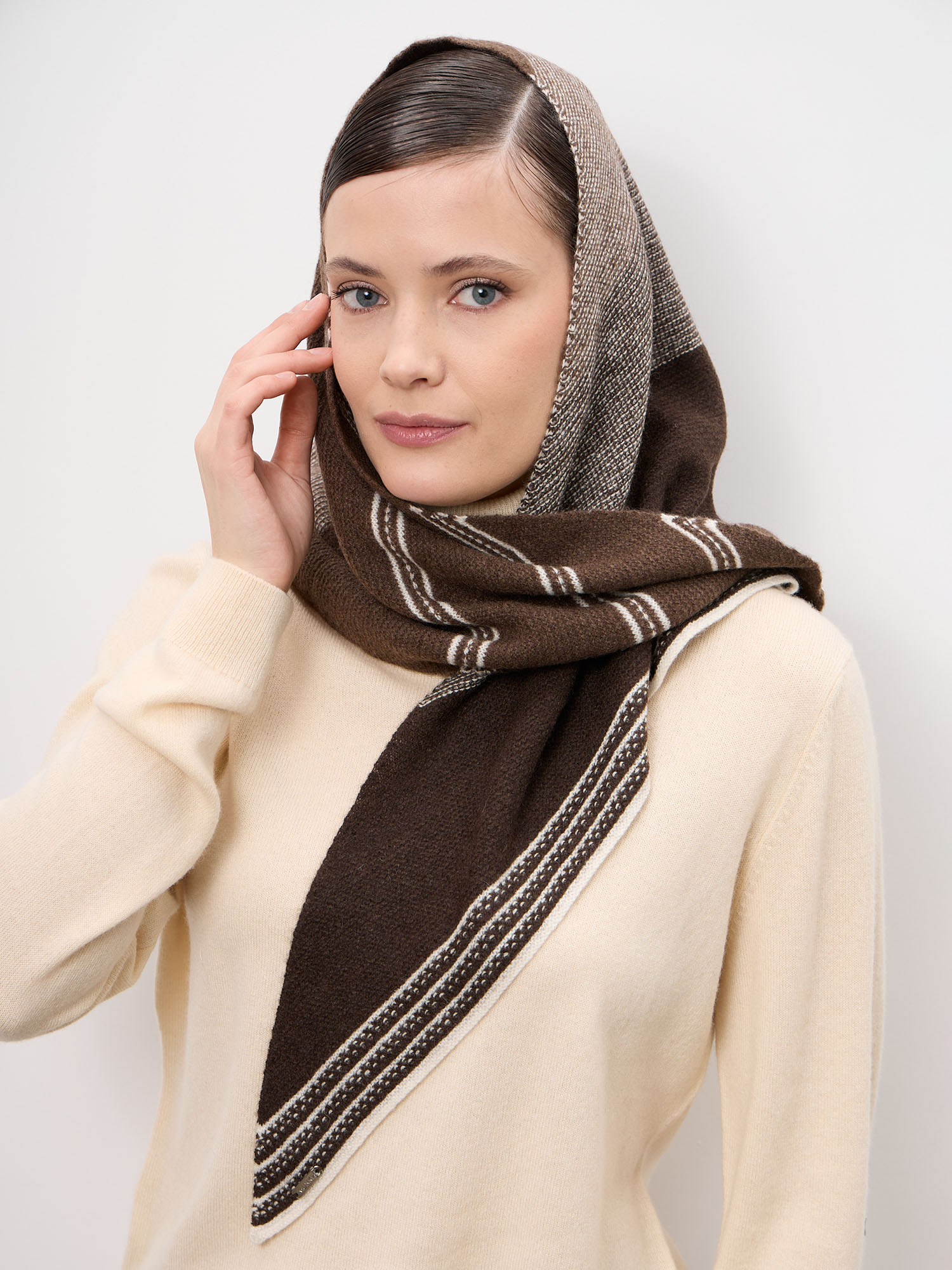 Модель выполнена в лаконичном дизайне с аккуратной фактурной вязкой и декоративными полосами по краю. Форма платка позволяет носить его разными способами: как головной убор, на плечах или в качестве стильного акцента на шее.