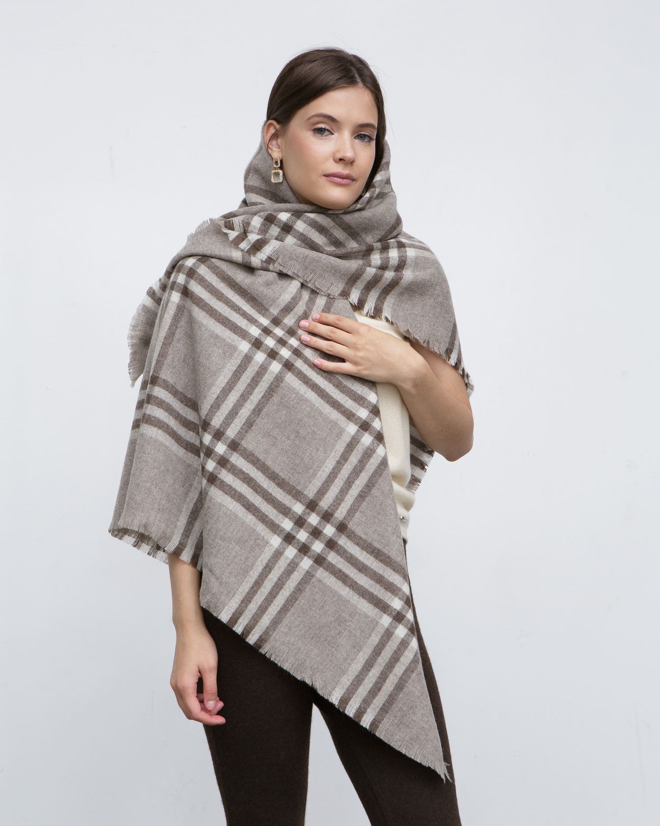 Модель выполнена в форме крупной косынки с эффектным клетчатым узором. Свободная форма позволяет носить платок различными способами — на плечах, вокруг шеи или в виде накидки, создавая разные стилистические решения.