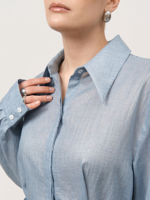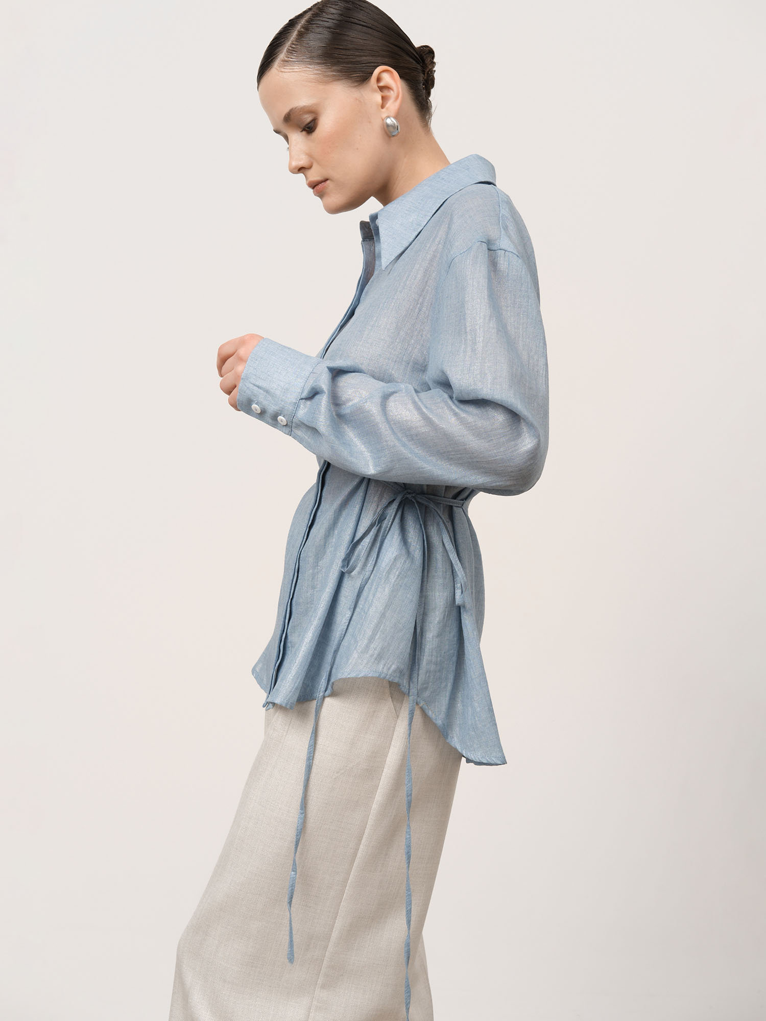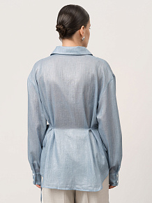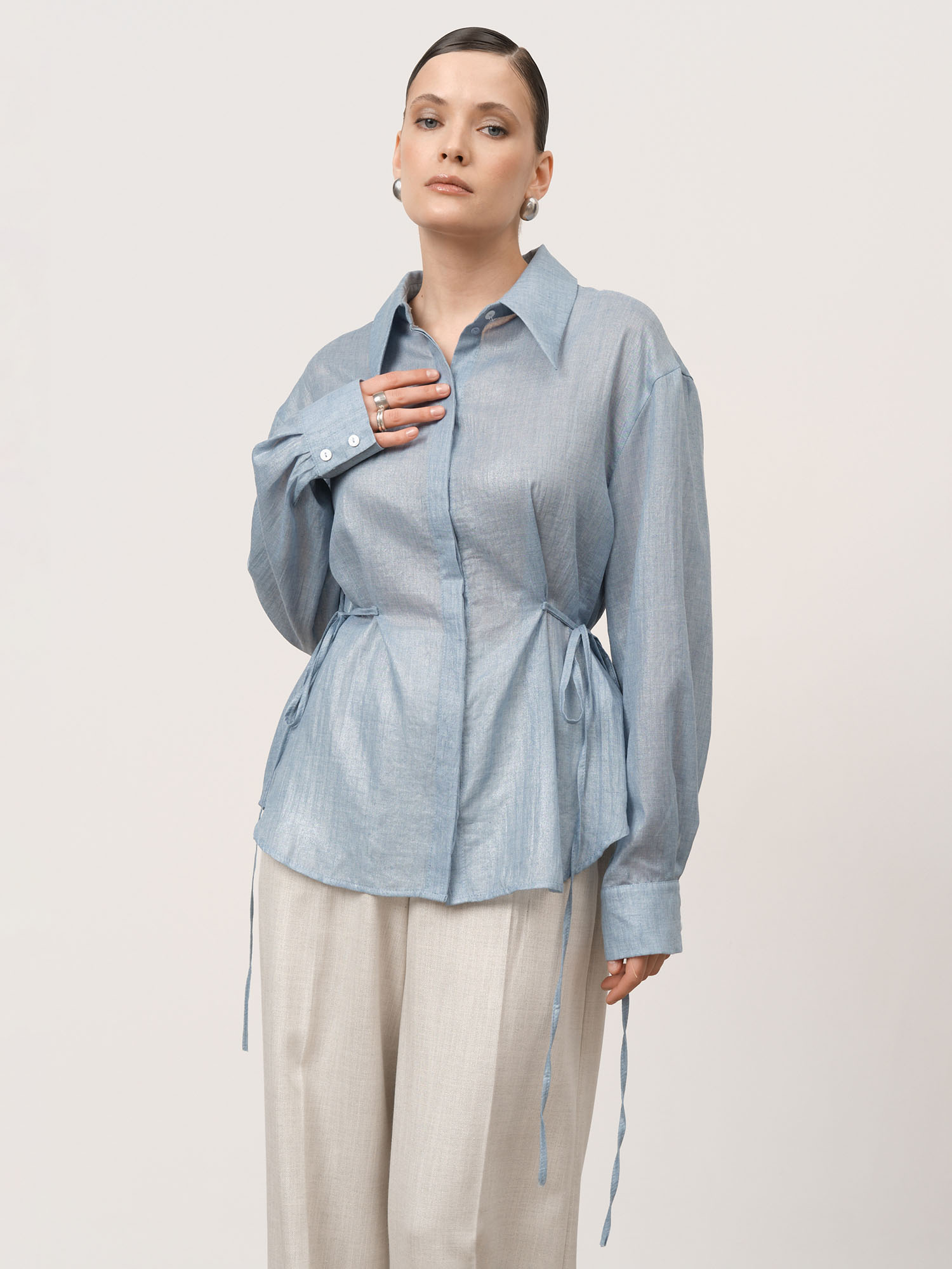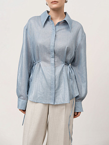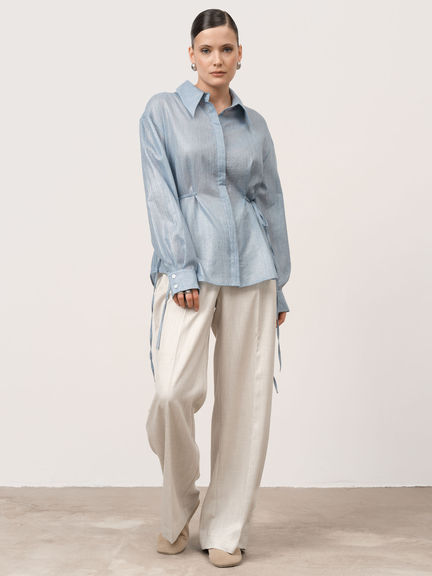 Застёжка на пуговицы, длинные рукава с манжетами, завязки по бокам, аккуратные швы, фактурная ткань с лёгким рельефом.