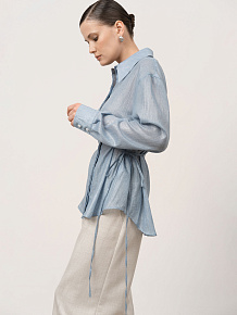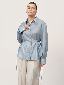 Полуприлегающий силуэт с классическим воротником и вертикальной фактурой ткани. Завязки по бокам позволяют подчеркнуть талию и варьировать посадку.