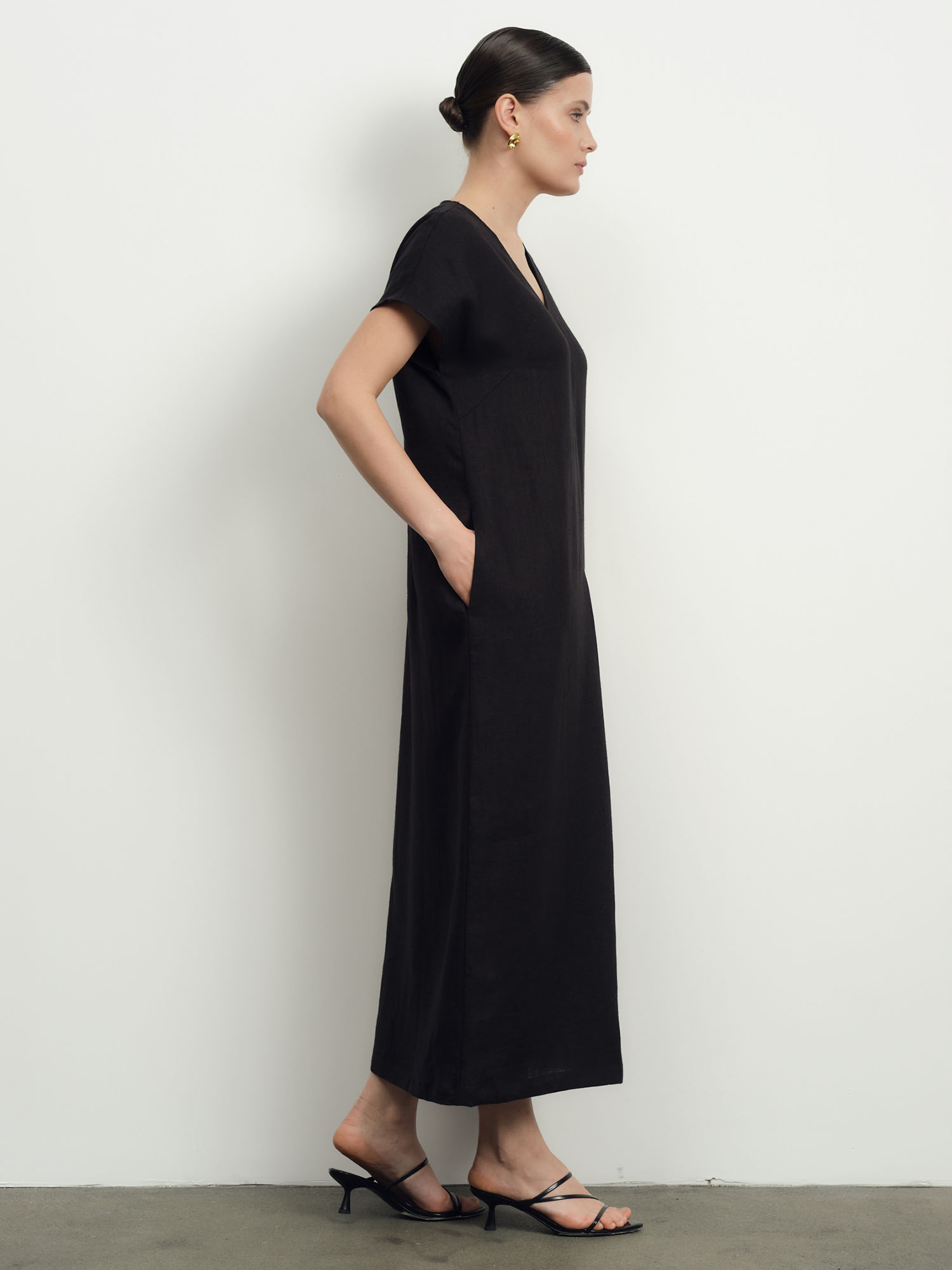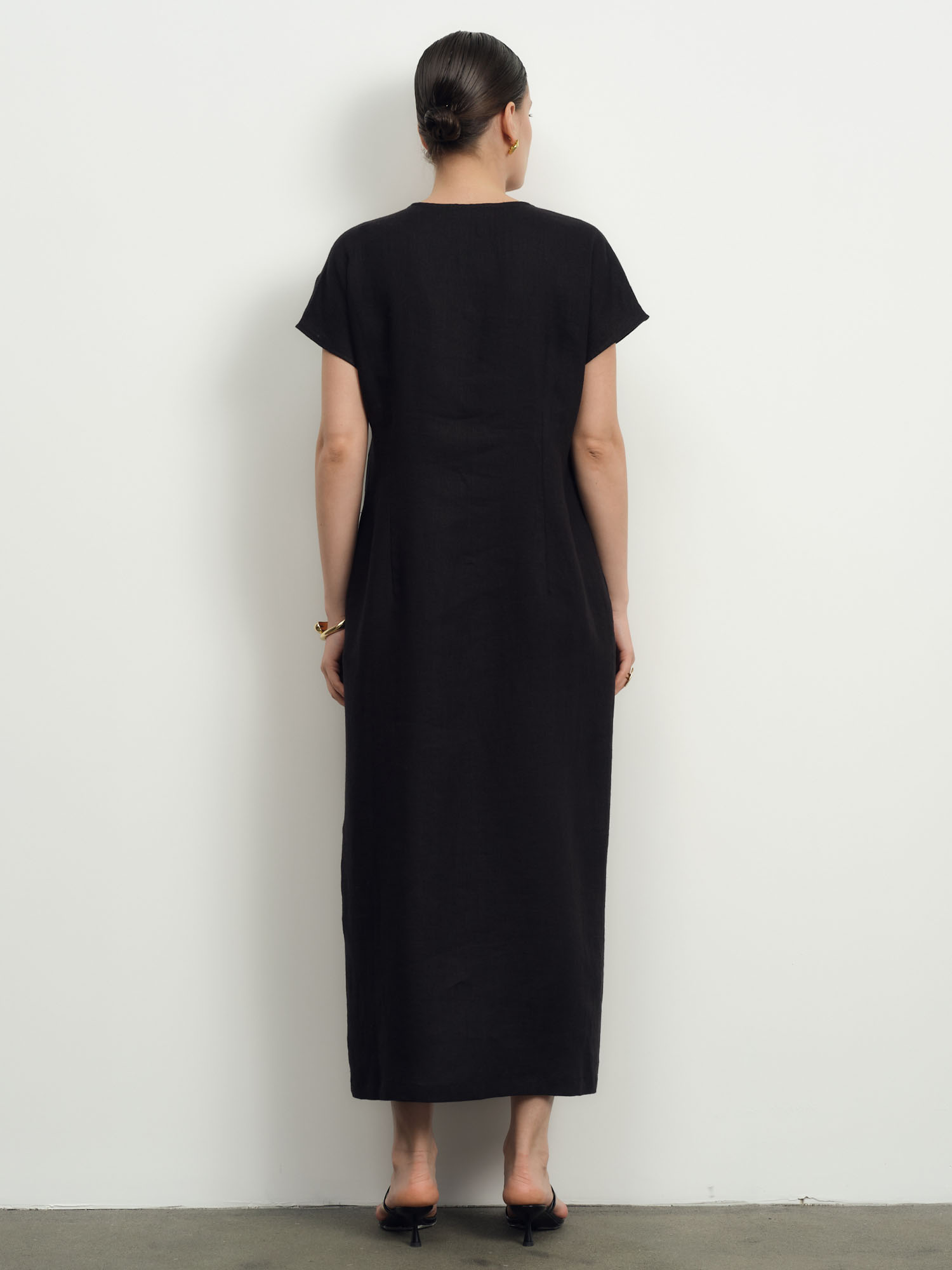 Прямой силуэт длины миди с V-образным вырезом и короткими рукавами. Минималистичный крой подчеркивает естественность и универсальность модели.