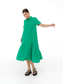 Платье выполнено в рубашечном стиле с прямым свободным кроем. Отложной воротник и застежка на пуговицы придают модели аккуратный и универсальный вид. Нижняя часть с присборенной юбкой добавляет объема и легкости, создавая динамичный и женственный силуэт.
